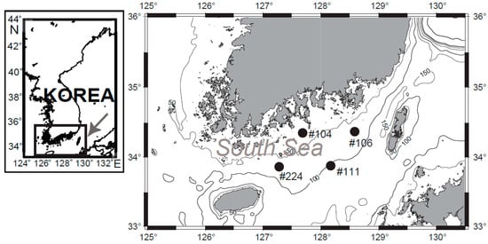 A map showing the location of the sampling areas in the South Sea of Korea. Filled circles indicate the four sampling sites (#104, #106, #111, and #224) at which zooplankton, common squid Todarodes pacificus, and other fish consumers were collected.