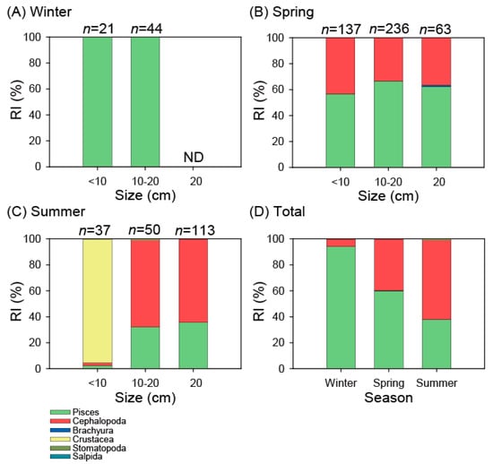 Size-related (mantle length, ML; three size classes, <10 cm, 10–20 cm, and >20 cm) and total (D) compositions of the stomach contents of common squid Todarodes pacificus based on the ranking index (%RI) expressed as a percentage of the sum of the RI values in the South Sea of Korea during February (winter, (A)), May (spring, (B)), and August (summer, (C)) 2021.