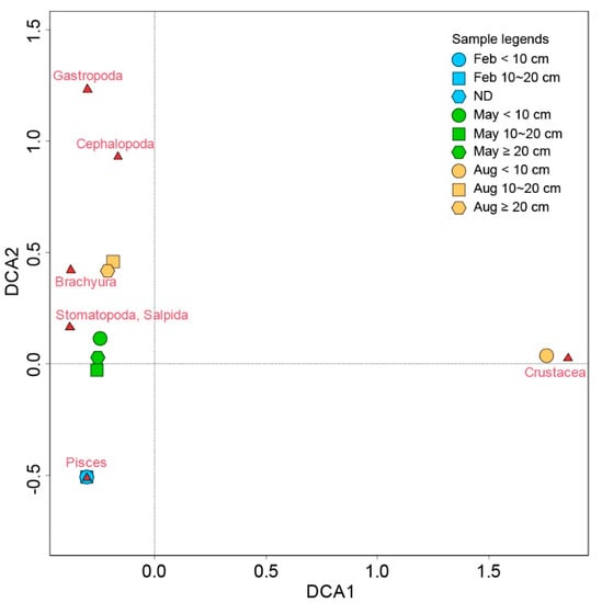 The arrangement of T. pacificus and its dietary items based on DCA ordination yielded eigenvalues of λ1 = 0.928, λ2 = 0.221, and λ3 = 0.138 for the first composition gradients (Figure 3). The smallest individuals of common squid collected in August were associated with Crustacea, whereas the other groups were plotted in the vicinity of Pisces in February, that of Stromatopoda and Salpida in May, and that of Brachyura in August.