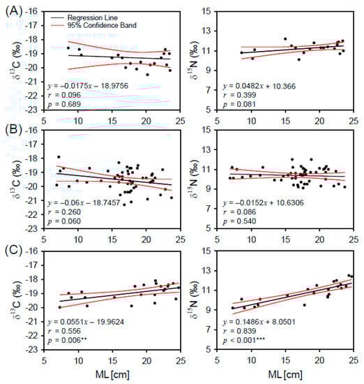 Regression relationships between δ13C—mantle length (cm, left) and δ15N—mantle length (cm, right) of common squid Todarodes pacificus collected in the South Sea of Korea during February (winter, (A)), May (spring, (B)), and August (summer, (C)) 2021. ** p < 0.01, *** p < 0.001.