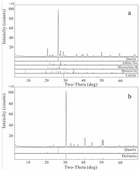 It can be seen from the X-ray diffraction analysis results of the core samples (Table 2 and Figure 3) that the main mineral of the thermal reservoir rocks of the Gaoyuzhuang Formation is dolomite, followed by quartz, and a small amount of clay minerals or feldspar and calcite. These results are similar to those of the thin section identification.