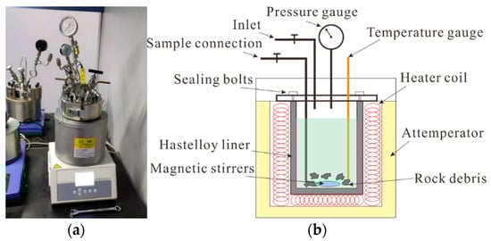 A high-temperature and high-pressure reaction vessel produced by century Senlang was used as the experimental instrument. The inner tank of the vessel is forged using Hastelloy alloy to prevent acid–base corrosion. The reaction vessel is heated using a heating collar, the maximum temperature can reach 300 °C, and the temperature control accuracy is 0.1 °C. The maximum pressure is 60 MPa. The maximum volume is 500 mL. A magnetic stirring rod is provided to realize full contact and mixing of the reactants. There is one air inlet and one sampling interface. The structure of the reactor is shown in Figure 4.