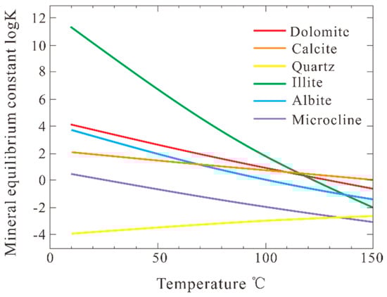 Table 4 presents the coefficients of the minerals. The calculated mineral equilibrium constants from room temperature to 150 °C are shown in Figure 6.