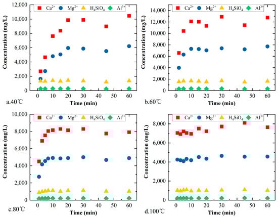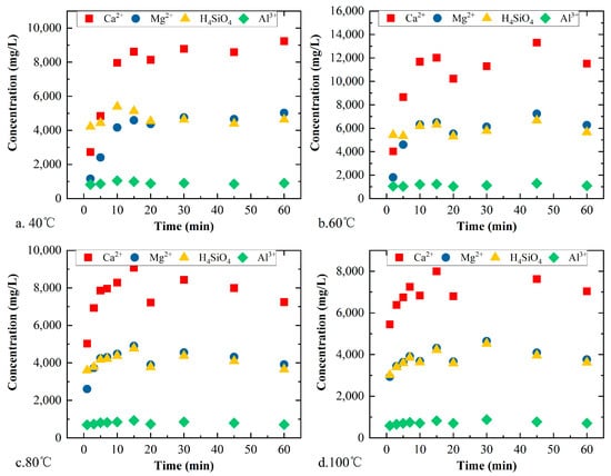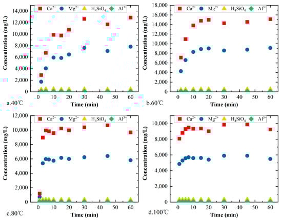 For core R1, the temperature has a large influence on the mineral reactions. The higher the temperature was, the faster the reaction rate was. Under 40 °C, the core sample was completely dissolved after about 20 min (Figure 7a), and the content of each ion component tended to be stable and did not change. The contents were stable after about 15 min at 60 °C (Figure 7b). For 80 °C and 100 °C, the stabilization times were shorter, only an estimated 10 min and 5 min, respectively (Figure 7c,d).