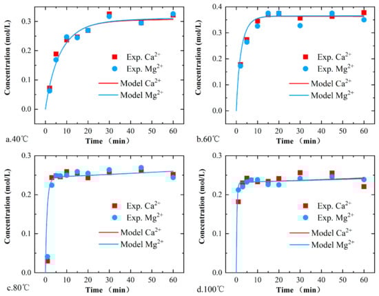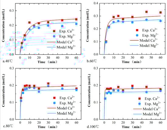 Temperature also played a significant role in controlling the reaction rate of R2. At 40 °C, all ions reached equilibrium after an estimated 30 min (Figure 8a). They reached equilibrium after an estimated 15 min at 60 °C (Figure 8b), and they reached equilibrium after 10 min and 5 min at 80 °C and 100 °C, respectively (Figure 8c,d). This is consistent with the experimental results for R1.