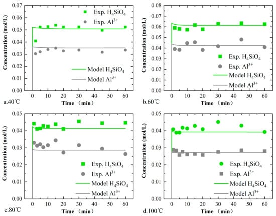 It can be seen from Equation (2) that the mineral reaction rate is also affected by the balance. Many scholars have studied thermodynamic data for minerals and have obtained a relatively unified understanding. The thermodynamic database used in this study was created by Blanc []. The database was compiled by Thermobridge in December 2020 and contains 85 major ion components, 945 complex ion components, 737 mineral components and 23 gas components.