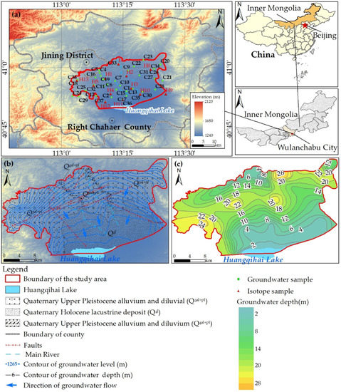 Location of the study area and water samples (a), hydraulic head field (b) and the burial depth of groundwater (c).