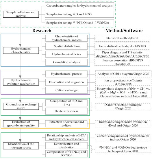 Methodology flowchart. At present, many methods are used to proceed the hydrochemcial research, such as Piper diagram, correlation analysis, Gibbs diagram, ion proportional coefficients, cluster–based methods [14,31,32,33,34,35,36,37]. According to previous studies and the study objectives, we used Excel to complete the statistical analysis. Statistics of the minimum, maximum, average and medium were used to reflect the concentration characteristics of the indices. The standard deviation (SD) was applied to reflect the variation degree between the average value and the actual value, and the coefficient of variation (Cv) was used to indicate the dispersion degree [38]. Based on the geostatistical methods, the spatial distributions of the main hydrochemical indices were obtained by using the Kriging interpolation with the help of ArcGIS 10.3. The Piper diagram drawn by Aquachem 4.0 and the iso–ionic–salinity (TIS) diagram were applied to classify the hydrochemical facies and the salinity distribution. Pearson correlation was undertaken to analyze the relationships among the hydrochemical indices via IBM SPSS Statistics 22. Gibbs diagram, ion proportional coefficients were conducted to reveal the hydrochemical evolution mechanism. Based on the binary phase diagram and chloro – alkaline indices, the cation exchange was judged. Integration of the δ15N(NO3) – δ18O(NO3) dual isotope technique and hydrochemical analyses was designed to trace the nitrate contamination. Origin 2020 was used to plot Gibbs diagram, TIS diagram, binary phase diagrams, and isotope distribution figures. The details of the methods are listed below.