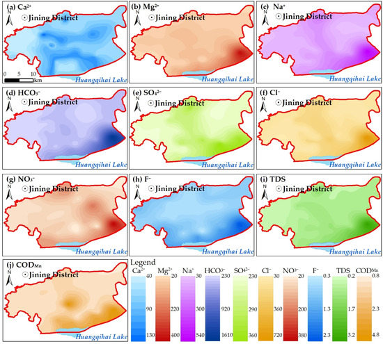 Spatial distribution of hydrochemical indices (a–j). The unit of TDS is g/L and the units of other indices are mg/L.