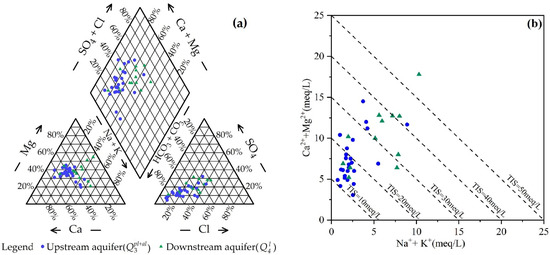 Based on the Piper diagram (Figure 4a), the anions were mainly distributed closer to the HCO3− side for the groundwater samples of the upstream aquifer (Q3al+ pl), while the cations were mainly distributed close to the Mg2+ and Ca2+ sides, indicating that the chemical facies upstream were mainly HCO3–Mg·Ca or HCO3–Ca·Mg. For the groundwater samples of the downstream aquifer(Q4l), the cations were obviously biased toward the side of Na+, and the concentrations of anions (Cl− and SO42−) increased. Therefore, the anion types gradually transitioned from HCO3 upstream to HCO3·Cl (Cl·HCO3) and Cl·SO4 downstream, and the types of cations changed from Mg·Ca (Ca·Mg) to Mg·Ca·Na (Ca·Mg·Na), and even Na·Mg·Ca (Na·Mg·Ca) and Na type. Noticeably, the NO3− mole fractions of the C29 and C30 samples were 36.25% and 33.18%, respectively. To reflect nitrate contamination [39,40], the NO3− ion was taken into account when determining the hydrochemical facies. Therefore, two new hydrochemical types, except the 49 types, appeared in the C29 and C30 samples, namely, the NO3·HCO3–Ca·Mg and HCO3·NO3·Cl–Ca·Mg facies. According to studies by Apollaro et al. [53], the iso–ionic–salinity (TIS) lines were added in the correlation plot of (Na+ + K+) vs. (Ca2+ + Mg2+) to reflect the ionic salinity. As shown in Figure 4b, the content of Ca2+ and Mg2+ was higher than that of Na+ + K+ on the whole, and the groundwater had low ionic salinity which ranged from 10.43 to 56.21 meq/L. The TDS values were comparatively low with an average of 744.56 mg/L which were in the range of fresh water (TDS < 1000 mg/L).