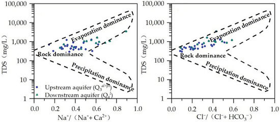 According to the Gibbs diagram, the main evolution mechanism of groundwater was classified into three types: evaporation, rock weathering and atmospheric precipitation [5,33,41]. As shown in Figure 5, the ratio of Na+/(Na+ + Ca2+) ranged from 0.14 to 0.59, and the ratio of Cl−/(Cl− + HCO3−) ranged between 0.05 and 0.59, indicating that the ions’ concentrations of groundwater in the study area were mainly affected by rock weathering. The Na+/(Na+ + Ca2+) and Cl−/(Cl− + HCO3−) ratios of the downstream aquifer (Q4l) were larger than those of the upstream aquifer (Q3al+pl). The burial depth of groundwater gradually became shallow from upstream to downstream, evaporation strengthened, some Ca2+ ions were precipitated as CaCO3, and the contents of Na+ and Cl− were further concentrated.