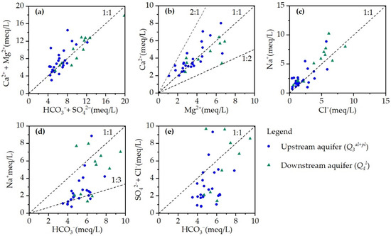 In general, Ca2+ and Mg2+ in groundwater mainly come from the dissolution of carbonate, silicate and evaporite, so the (Ca2+ + Mg2+)/(HCO3− + SO42−) ratio was used to determine the main sources of Ca2+ and Mg2+ [16]. As shown in Figure 6a, the samples were mostly located above the 1:1 line, led by the groundwater samples in the upstream aquifer (Q3al+pl). Combined with Table 4, r (Ca2+ vs. SO42−) and r (Mg2+ vs. SO42−) were high, which indicated that Ca2+ and Mg2+ in the groundwater were derived not only from the dissolution of carbonate and silicate minerals, but also from the dissolution of sulfate minerals. The ratios of (Ca2+ + Mg2+)/(HCO3− + SO42−) in some groundwater samples were less than 1:1, which may be caused by carbonate precipitation and cation exchange.