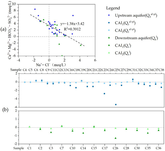 If cation exchange was the dominant process influencing the contents of Na+, Ca2+ and Mg2+, the relationship between the two parameters was negative linear, with a slope of −1.0. As shown in Figure 7a, there was a certain linear relationship between (Na+ – Cl−) and (Ca2+ + Mg2+ − SO42− − HCO3−) in groundwater, but the correlation coefficient was low. It was indicated that cation exchange existed in the hydrogeochemical process, but it did not play a dominant role in the changes in the contents of Na+, Ca2+ and Mg2+.
