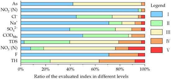 According to the Groundwater Quality Standard (GB/T 14848-2017) [28], groundwater quality is divided into five levels (I~V). Groundwater at levels I~III can be used for domestic drinking, groundwater at level IV can be used for drinking after proper treatment, and groundwater at level V is not suitable for drinking. Taking level III as the standard (Table 1), if the concentration of the evaluated index is inferior to level III, it means that the index is over the standard. When comprehensively evaluating the groundwater sample, the determination of the evaluated level obeys the inferior principle [28].