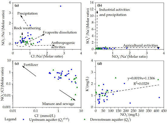 Contaminations coming from manure and sewage would show a higher Cl− content and a lower NO3−/Cl− ratio. The Cl− molar concentration should usually be greater than 1 mmol/L, while the NO3−/Cl− molar concentration ratio should range between 0.001 and 0.1 [44,67]. The contaminations originating from synthetic NO3 fertilizer via agricultural activities should show characteristics of low Cl− concentrations and high NO3−/Cl− ratios, the Cl− content should be less than 0.1 mmol/L, and the NO3−/Cl− molar concentration ratio should range between 0.1 and 10 [18]. As shown in Figure 10c, the Cl− contents were generally more than 1 mmol/L, and the molar concentration ratios of NO3−/Cl− ranged between 0.1 and 10, with an average value of 0.58. The points were mostly distributed in the upper–right of Figure 10c, indicating that the nitrate content in groundwater was affected by a variety of factors such as manure, sewage and fertilizers. To further explore the probability of synthetic NO3 fertilizer as a probable source of nitrate, the bivariate relationship between NO3− and K+ was examined. There will be a strong correlation between NO3− and K+ if NO3 originates from synthetic NO3 fertilizer [7]. In fact, there was a weak correlation between NO3− and K+ (Figure 10d), indicating that synthetic NO3 fertilizer is not the dominant source of NO3− in the study area.