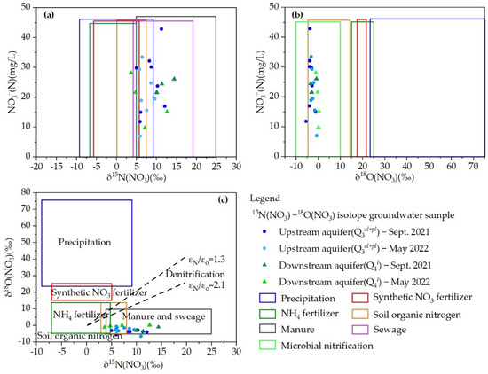 Under an oxidative environment, NH4+ is transformed into NO3− by Nitrobacter, which is called nitrification. According to the experimental research of Kendall [68], one O atom of NO3 comes from the atmosphere, and the other two O atoms come from H2O in environment, i.e., δ18O(NO3) = 2/3δ18O(H2O) + 1/3δ18O(O2). The δ18O(H2O) average of groundwater in the study area was −9.07‰, and the δ18O(O2) value was +23.5‰ [69]. Based on this, the δ18O(NO3) theoretical value was calculated as 1.79‰. The actual values of δ18O(NO3) in the study area ranged from −6.47 to +1.24‰, and the average was −2.40‰. There was a difference between the actual values and theoretical value, the main possible reasons were: (1) the real conditions were different from the laboratory cultures; (2) the δ18O(O2) value was cited from previous study not from actual measurement. According to the previous research, the δ18O(NO3) value produced by microbial nitrification ranged from −10 to +10‰ in general [47,68,70]. As shown in Figure 11b, the δ18O(NO3) values all fell within the above range and indicated that nitrification was the main process of nitrogen transformation.