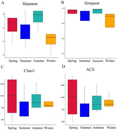 Diversity and community richness indices in four different seasonal groups. (A) comparison of Chao1 diversity indices in four different seasonal samples. (B) comparison of Shannon diversity indices in four different seasonal samples. (C) abundance measurement index calculated by the Simpson method. (D) abundance measurement index was shown by the ACE.