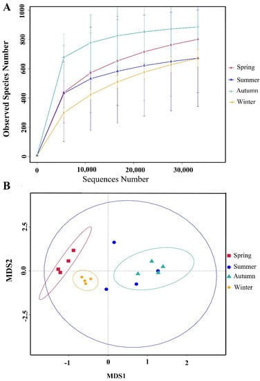 The rarefaction curve and NMDS analysis of all samples in different seasons. (A) Rarefaction curve analysis showing the relationship between sequences number (x-axis) and observed species number (y-axis). (B) NMDS plot of Bray–Curtis distances among four seasonal samples based on OTUs for bacteria.