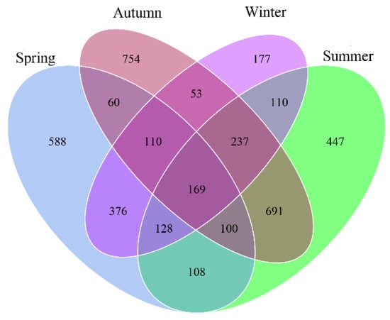 Venn diagram describing the OTU overlap in microbial communities analyzed in the different seasons.