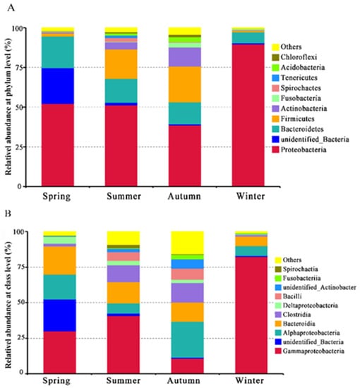 Comparison of microbial community structures on the different seasonal groups. (A) microbial community compositions at the phylum level. (B) microbial community compositions at class level.