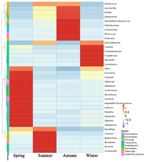 Comparison of the microbial community structures at the genus level on the different seasonal groups.