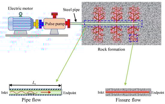 There are mainly two reasons why PHF can remarkably accelerate the breakdown of rock. One is that the initiation pressure of rock decreases due to the fatigue load applied by PHF [,,]. The other is that the peak pressure of fluid increases due to the superposition effect of pressure waves applied by PHF [,]. At present, the distribution law of peak pressure is unclear inside the pipe and fissure during the PHF. The inner reason is that the superposition law of pressure waves is vague. The superposition of waves and the distribution of pressure are affected by the pulse parameters and geometric parameters of pipe and fissure. The pulse parameters include frequency and amplitude. The geometric parameters include pipe length and aperture. Some studies discussed the characteristics of pressure propagation and distribution [,,,]. These studies gave valuable results. However, these studies are inadequate. It is necessary to conduct a systematic study to reveal the law of peak pressure affected by the pulse and geometric parameters.