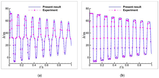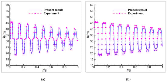 Results are shown in Figure 2. It can be seen that the water head (or pressure) periodically fluctuates at the middle point and endpoint due to the reflection of pressure waves. However, the peak of the water head gradually decreases due to the friction drag effect of the wall. The present computation results agree well with the experimental results []. Particularly, the present peak and frequency of the water head given by the numerical computation have good consistency with the experimental data, which indicates that the present algorithm and calculation program can give accurate simulation results.