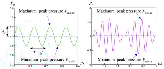 where p is the fluid pressure. The normalized pressure Pn is represented by Pn = p/pav, where pav is the average pressure of the sine pulse at the inlet. Essentially, Pn represents the magnification of pressure, which can be used to describe the magnification level of fluid pressure from the inlet (pav) to any position (p). In the following analysis, the maximum peak pressure is expressed by Pn,max, and the minimum peak pressure is expressed by Pn,min, as shown in Figure 4.