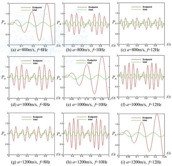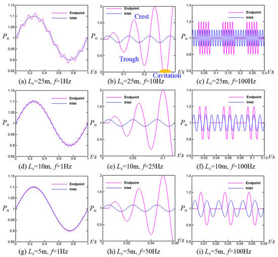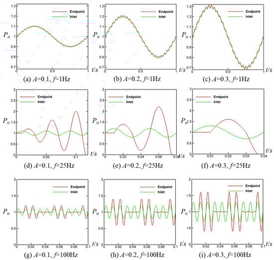 Normalized pressure–time Pn-t curves at inlet and endpoint: (a) Lx = 25 m, f = 1 Hz; (b) Lx = 25 m, f = 10 Hz; (c) Lx = 25 m, f = 100 Hz; (d) Lx = 10 m, f = 1 Hz; (e) Lx = 10 m, f = 25 Hz; (f) Lx = 10 m, f = 100 Hz; (g) Lx = 5 m, f = 1 Hz; (h) Lx = 5 m, f = 50 Hz; (i) Lx = 5 m, f = 100 Hz. All normalized pressures are dimensionless quantities.