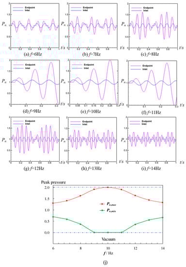 Normalized pressure–time Pn curves at inlet and endpoint when Lx = 25 m: (a) f = 6 Hz, (b) f = 7 Hz, (c) f = 8 Hz, (d) f = 9 Hz, (e) f = 10 Hz, (f) f = 11 Hz, (g) f = 12 Hz, (h) f = 13 Hz, (i) f = 14 Hz. (j) Relationship between the normalized peak pressure Pn,max, Pn,min and frequency f at endpoint. All normalized pressures are dimensionless quantities.