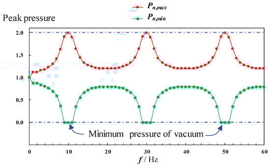 Because the sine wave has periodicity, there may be multiple frequencies that belong to the optimal frequency. We tested a series of frequencies from low to high with a small frequency interval. Results show that, indeed, there is a family of frequencies at which the maximum peak pressure is enhanced by 100% up to Pn = 2 as shown in Figure 7. These optimal frequencies include 10 Hz, 30 Hz and 50 Hz. It is found that the minimum peak pressure approaches 0 near these optimal frequencies. Namely, the hydrodynamic cavitation occurs near these frequencies, which can remarkably enhance the local pressure at the endpoint due to the collapse of cavitation bubbles.