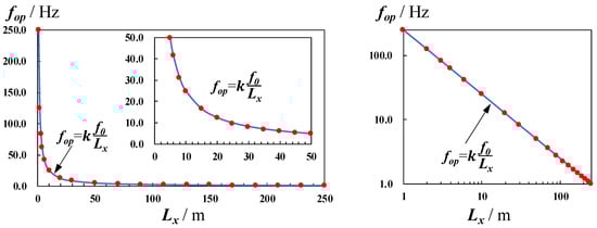 Relation between the optimal pulse frequency fop and pipe length Lx when the wave velocity is 1000 m/s. The left drawing is plotted in linear coordinates and the right drawing is plotted in log–log coordinates. Here we take k = 1 as an example to show the curve.