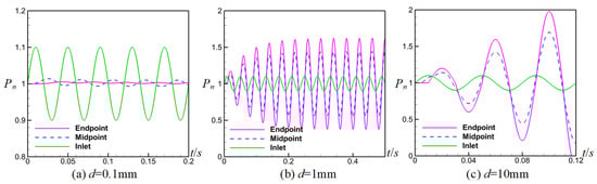 Normalized pressure–time curves at inlet, middle point and endpoint, where Lx = 10 m and f = 25 Hz: (a) d = 0.1 mm, (b) d = 1 mm, (c) d = 10 mm.