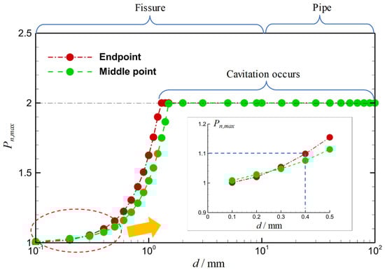 From Figure 10 and Table 1, we find that the peak pressure at the endpoint can be enhanced due to the effects of the inlet pulse. When d > 0.9 mm, the magnification effect is apparent, and the maximum peak pressure at the endpoint can be enhanced by more than 50%. When d > 1.3 mm, the maximum peak pressure at the endpoint can be increased by 100%, and the cavitation phenomena occur near the wave trough due to the appearance of a vacuum at the endpoint. However, in narrower fissures (d < 0.9 mm), the magnification is not apparent. Particularly, there is not any enhancement of peak pressure when d < 0.4 mm. Instead, inhibition effects are observed. It is noteworthy that the above phenomena and discussion are given under the condition that the pulse frequency is at the optimal frequency. In addition, the inlet average pressure is 1 MPa and the saturation vapor pressure is 0.0024 MPa when the water temperature is 20 °C []. Hence, the critical pressure of cavitation is Pn = 0.0024, which is very close to 0, in the Pn-t plot shown in Figure 9c. The cavitation occurs when the minimum peak pressure is less than 0.0024 MPa (Pn < 0.0024). According to this criterion, the cavitation range is given in Figure 10. Our results indicate that for wider fissures and pipes (d > 1.3 mm), it is possible to further enhance the fluid pressure by inducing cavitation using the optimal pulse frequency. Usually, the local pressure can be enhanced to 50 MPa or higher during the collapse stage of cavitation bubbles. Therefore, it is vital to adopt the optimal pulse frequency to enhance the peak pressure of the fluid at the endpoint.