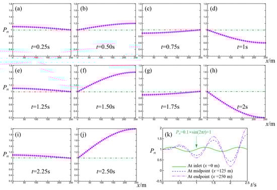 Normalized pressure–position curves during 2.5 pulse periods where Lx = 250 m and f = 1 Hz. (a–j) t = 0.25–2.5 s, (k) Normalized pressure–time curves during 2.5 pulse periods at inlet, midpoint and endpoint.