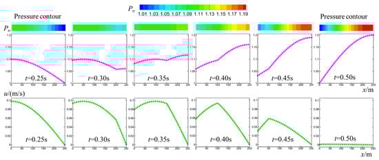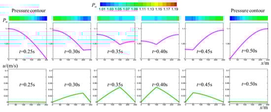 To further explain the magnification phenomenon of amplitude at the endpoint, we focus on the second 1/4 pulse period 0.25 s ≤ t ≤ 0.5 s. More detailed evolution processes are computed and extracted, as shown in Figure 15, including the pressure contours and the pressure–time and velocity–time curves. At t = 0.25 s, the pressure and velocity follow a 1/4 sine distribution in the spatial direction (pipe-axis direction). The fluid velocity is 0.1 m/s at the inlet (x = 0 m). The fluid velocity in the pipe is larger than 0, indicating that there is a dynamic impact load in the x direction. Figure 15 shows that the endpoint pressure gradually increases from Pn = 1 to Pn = 1.2 when the time increases from t = 0.25 s to t = 0.5 s. There are two main reasons causing the increase in pressure at the endpoint. The first reason is the self-reflection of the pressure wave, which provides the basic part of pressure enhancement. The second reason is the transformation from dynamic energy to pressure energy, which provides the additional part of pressure enhancement. Continuous impact loads are injected at the inlet, and these dynamic energies are periodically transformed into pressure at the endpoint. Therefore, the peak pressure is periodically enhanced at the endpoint.
