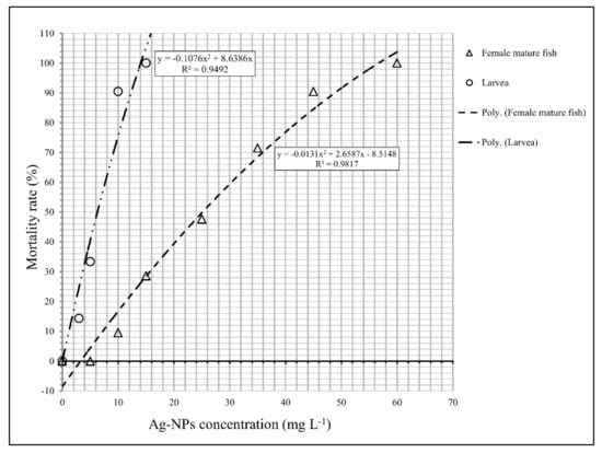 Results in Figure 1 confirm a positive correlation between mortality rate and Ag-NP concentrations for both larvae and adult fish (p < 0.01) 96 h after exposure to Ag-NPs. The greatest mortality rate was recorded in the highest concentration for larvae and both life stages fish.