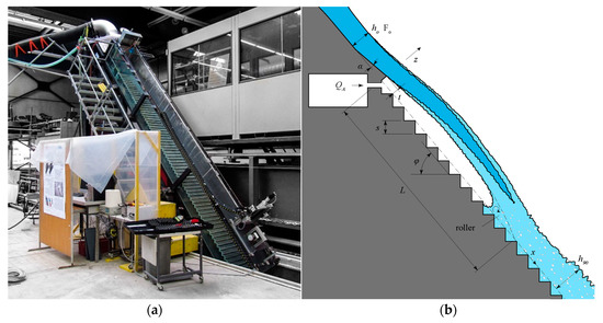 Figure 1. (a) Experimental facility with a chute bottom angle of φ = 50°; (b) Definition scheme of a stepped spillway aerator.
