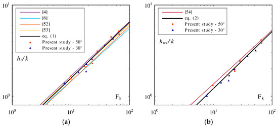 The equivalent blackwater flow depth at the inception point hwi gave slightly smaller depths than [60], which might be explained by a different method to locate the inception point (Figure 3b). The following relationship was obtained for 30° ≤ φ ≤ 50° (r2 = 0.988)