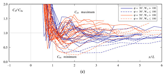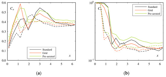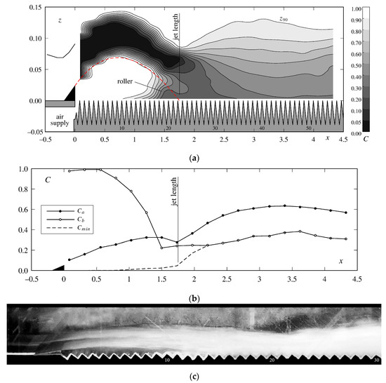 The bottom air concentration was by definition Cb = 1 in the air cavity (Figure 4b). However, there was generally a small number of drops below the jet that slightly decreased Cb. Upstream of the jet impact, the roller decreased Cb and a minimum often occurred in the roller (here at x = 1.5 m). After the jet impact, there were various trends that will be described further below. Unlike what was observed for smooth chute aerators, Cb did not rapidly decrease towards values below a few percent. The minimum air concentration Cmin was located in the center of the jet (blackwater core) at the beginning, and was then located at the pseudo-bottom after the jet impact as indicated by the overlap of Cb and Cmin.