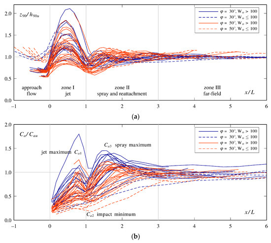 The relative jet blackwater core length Lbwc/ho for the present study was shorter than the estimation obtained from [70] (Figure 7b). All tests with Fo = 3.2 and all tests with ho = 0.052 m except one (test 34 with the steepest deflector) still had a blackwater core at the jet impact and therefore no Lbwc could be calculated. The results with Fo = 5.5 showed that ho still had an influence on Lbwc/ho, which was likely an effect of a different approach flow turbulence for each ho. The slope of the [70] relationship could be adapted with satisfactory results to (r2 = 0.798)
