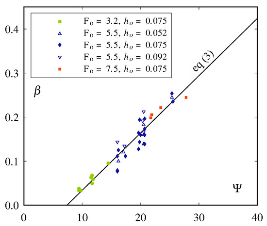 Figure 6. Air entrainment coefficient β as a function of Ψ = Fo·(1 + sin φ)1.5·(1 + tan α)3.