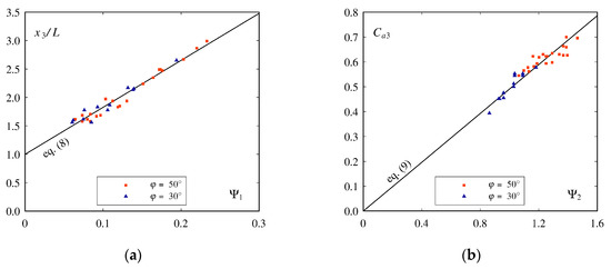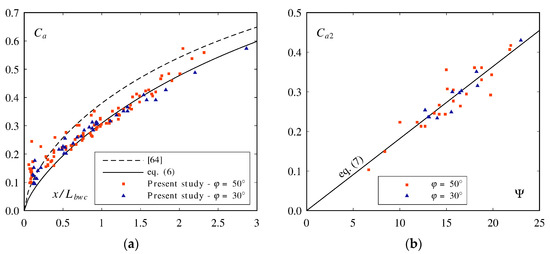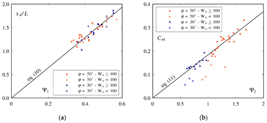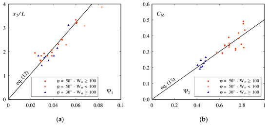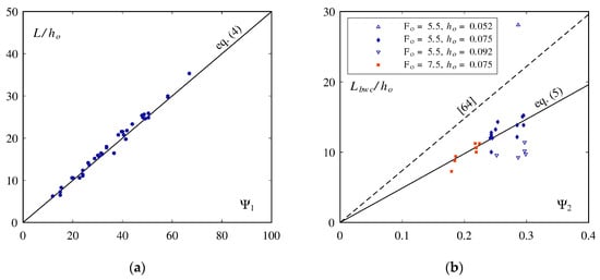Figure 7. (a) Relative jet length L/ho as a function of Ψ1 = (1 + sin φ)2·(1 + tan α)4·Fo1.4·(t/ho)0.4; (b) Relative blackwater core length Lbwc/ho as a function of Ψ2 = Fo−1·(1 + tan α)−0.5·(1 + sin φ).