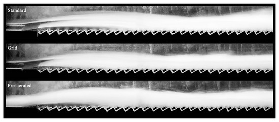 The tests were designed to study the influence of the chute geometry—chute angle φ and step height s—the influence of the approach flow conditions—Froude number Fo and flow depth ho—as well as the deflector geometry—deflector angle α and deflector height t (Figure 1b). A total of 18 reference tests without the aerator and 44 aerator tests were performed (Table 1).