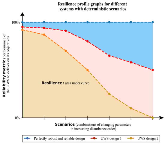 A desired trait of an engineered system that underpins any ‘safe-to-fail’ design approach is resilience. Despite being used extensively in recent water policy discussions [], resilience is still an elusive term with different definitions offered according to the context. Holling’s seminal definition, stemming from ecological system’s analysis [,], formalizes resilience as ‘the capacity to absorb disturbance so as to still retain essentially the same function, structure, identity, and feedbacks’. This definition gave rise to various alterations, but generally, all interpretations refer to the capacity of a system to absorb, adapt to, or recover from disturbance and cope with stress []. Building on past definitions, Makropoulos et al. [] proposed a resilience metric for UWSs that maps the ‘degree of continued performance of the system under disturbance’. In this work, we adopt this metric to quantify resilience.
