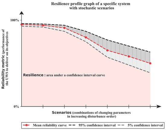An advantage of the resilience assessment method discussed above is that it naturally incorporates uncertainty in its conceptualization. Projections, parameter estimations, and stochastic variables are mixed in the formulation of scenarios, while it is acknowledged that the behavior of complex systems under the scenario sets is also uncertain. However, as originally formulated, the resilience metric is static. To encapsulate uncertainty in the resilience metric estimation per se, we employ a stochastic procedure: an ensemble of scenario realizations is generated for each scenario that incorporates some stochastically varying inputs or event probabilities. Hence, instead of a performance curve in the resilience profile graph, a cloud of performance points per scenario is generated. Next, we can use these points to generate curves that correspond to the mean performance curve and other confidence intervals (CI), quantifying uncertainty in the resilience estimation. Figure 3 illustrates an example of such an approach.