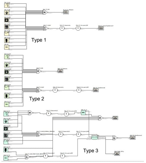 Urban water flows (i.e., demand, supply, drainage, and wastewater) are simulated by generating, aggregating, and transmitting demand signals, starting from the household water appliances and moving toward the source [,,].