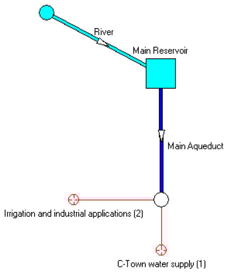 Hydronomeas [,] is a decision support system (DSS) for water resources management and can simulate and optimize rules for any (raw) water supply system. Reservoirs, pumping stations, aqueducts, borehole groups, river intakes, and other components of water supply systems are represented as a graph network. Targets are employed for water resources allocation of different uses (e.g., drinking water, water for irrigation or industrial needs, etc.), on a daily or monthly time step. Hydrologic variables (such as precipitation, runoff, and evaporation) are model inputs to allow the model to assess water availability. The use of synthetic (stochastically generated) inputs allows for the encapsulation of hydrologic uncertainty in the uncertainty-aware simulation and analysis of the system. Operational rules, pricing strategies, and unit costs can also be assessed and optimized. In particular, a recently developed Python version of Hydronomeas, Hydronomomeas2020 [] is used as the software wrapper to allow interoperability with other models.