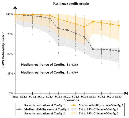 The resilience profile graphs for both configurations are presented in Figure 7. The uncertainty bands stemming from the 5% and 95% CIs are illustrated. The resilience scores for 5%, 50%, and 95% CIs are summarized in Table 3. The graph suggests that overall, Configuration 2 is more reliable. Especially, for the upper bounds, Configuration 2 is close to an ideal system with a score of 0.969 and maintains a wide performance gap in the median and lower bounds. Interestingly, in the group of Scenario 2, while the median reliability curves differ significantly, due to uncertainty, there exist overlapping areas where the performance of both configurations is comparable, but with different probability. As shown, in the 95% CI, Configuration 1 is performing similarly to the median of Configuration 2, while in the 5% CI, Configuration 2 performs worse that the median of Configuration 1. On the contrary, in the group of Scenario 3, there is no overlap of the CIs, signifying the distinctive advantage of Configuration 2, under more extreme stress. This result is also indicative for the added value of the improvements in terms of uncertainty quantification made in this work to the original resilience assessment methodology. By quantifying uncertainty as an integral part of the assessment of the scenarios, a more informed and nuanced decision making is possible.