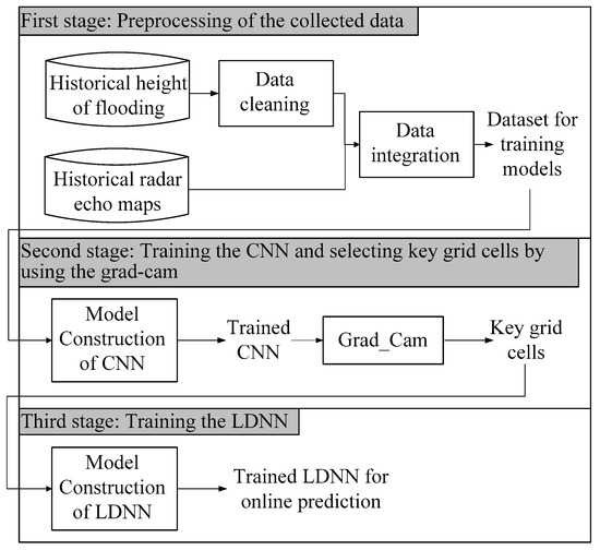 Figure 3 illustrates the three-stage computational framework proposed in this paper. Our aim is to predict the flood height in grid cell A. The first stage involves data pre-processing, aimed at sorting out the historical flood records pertaining to cell A and finding the radar echo map for the corresponding time point. The second stage involves training a CNN using the radar echo map identified in the previous stage (as the input) and the flood height of A (as the output). After training the CNN, Grad-Cam is used to find the grid cells that are key to estimating flood height in area A. The final stage involves using the key grid cells as input into a lightweight deep neural network (LDNN) for modeling and prediction. In the following subsection, we discuss the collection, cleaning, and integration of flood-related data and radar echo maps. We then introduce the CNN architecture, after which we describe how Grad-Cam is used to identify key grid cells. In the final subsection, we introduce the LDNN used in this paper.